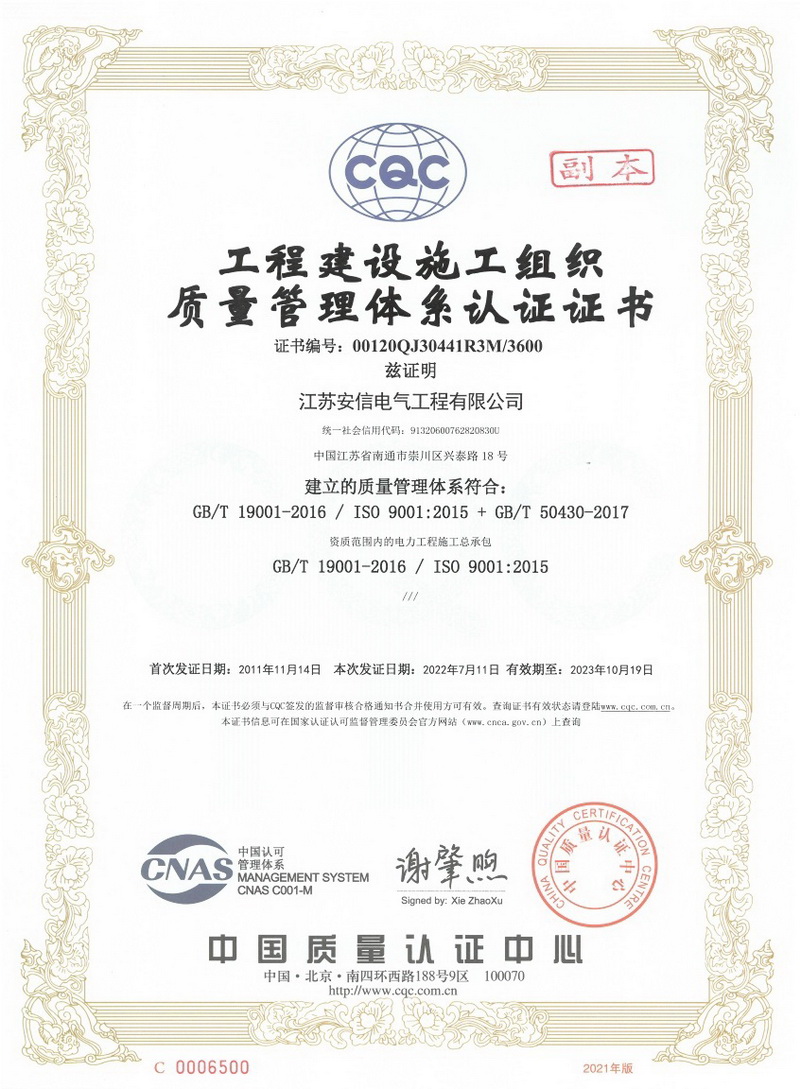 在創業之初,公司就堅持高起點的戰略思路,廣納賢才,集聚行業精英,創新發展,做優企業品牌。現已取得:承裝二級、承修二級、承試二級,電力工程施工總承包二級,輸變電工程專業承包二級,建筑工程施工總承包二級,建筑機電安裝專業承包二級,地基基礎專業承包二級資質證書,并通過了質量、環境、職業健康和安全管理體系認證,確保各項工作有序管控。